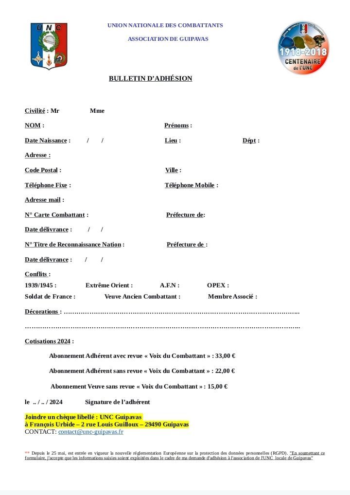 Catégories Actualités Bulletin d’adhésion Auteur de l’article Par François Date de l’article 28 mars 2025 ← 8 mai au R-Kerhuon et à Guipavas → 🇫🇷 Union Nationale des Combattants