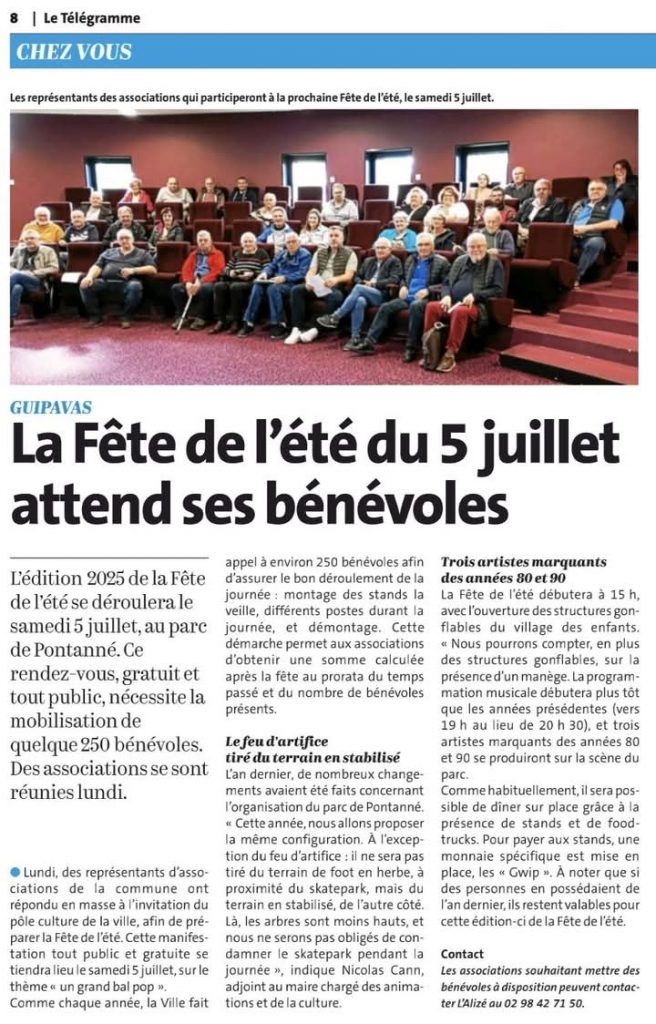 Catégories Actualités Préparation de la fête de l’été 2025 Auteur de l’article Par François Date de l’article 17 mai 2025 Source le télégramme . ← 🇨🇵 8 mai 2025 à Guipavas et au Relecq-Kerhuon🇨🇵 → Appel du 18 juin